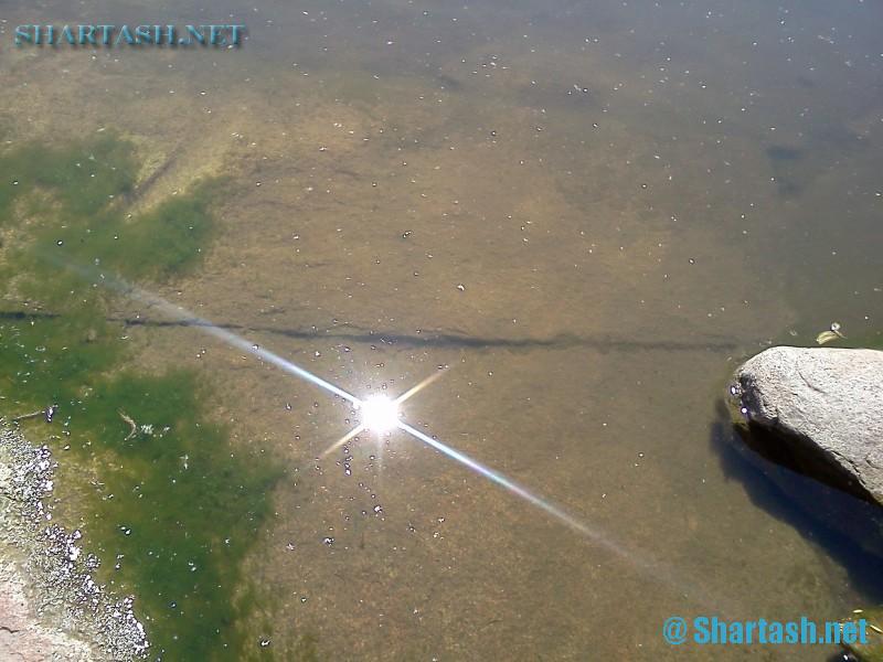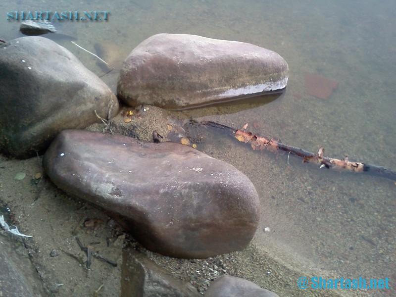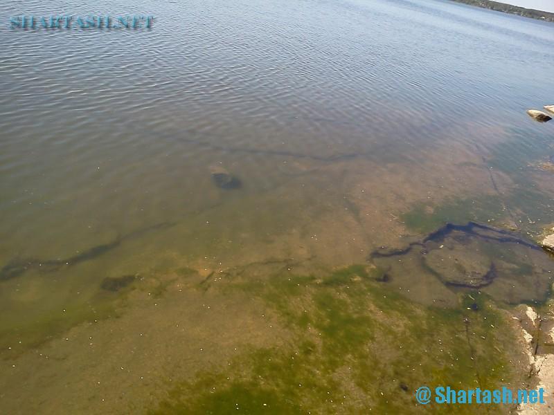 Такое впечатление, что тут стоял на берегу некий обьект, который был разрушен чем-то. Причем - оплавленные обломки (бурые камни) можно увидеть и на самом берегу и на холме около берега. А плиты вероятно шли к этому обьекту и потом уходили в озеро. Насколько глубоко расположены плиты и где они кончаются - сказать трудно, потому что дно покрыто илом и в мутной воде разглядеть что-то довольно трудно.